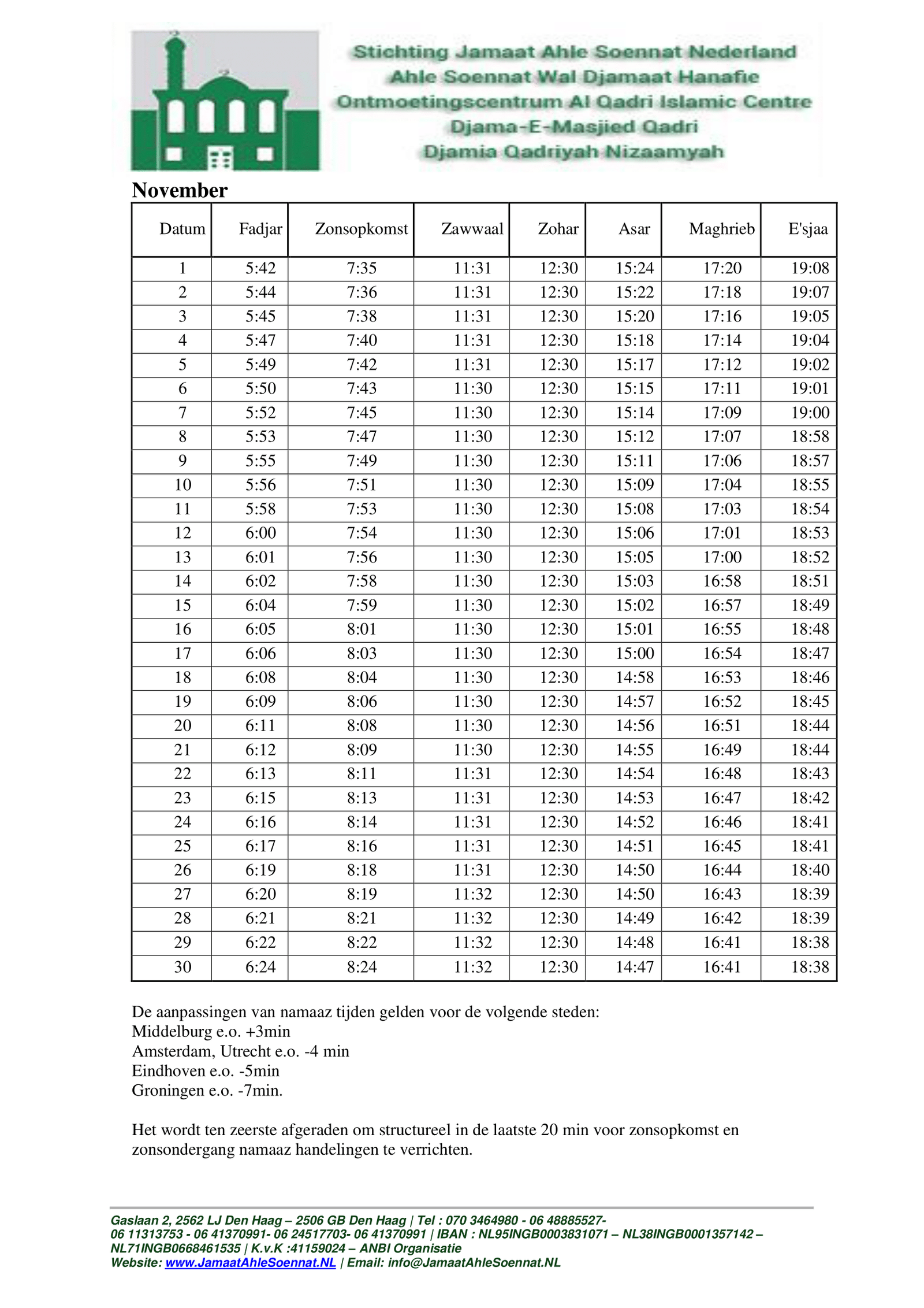 Namaaz tijdtabel – November